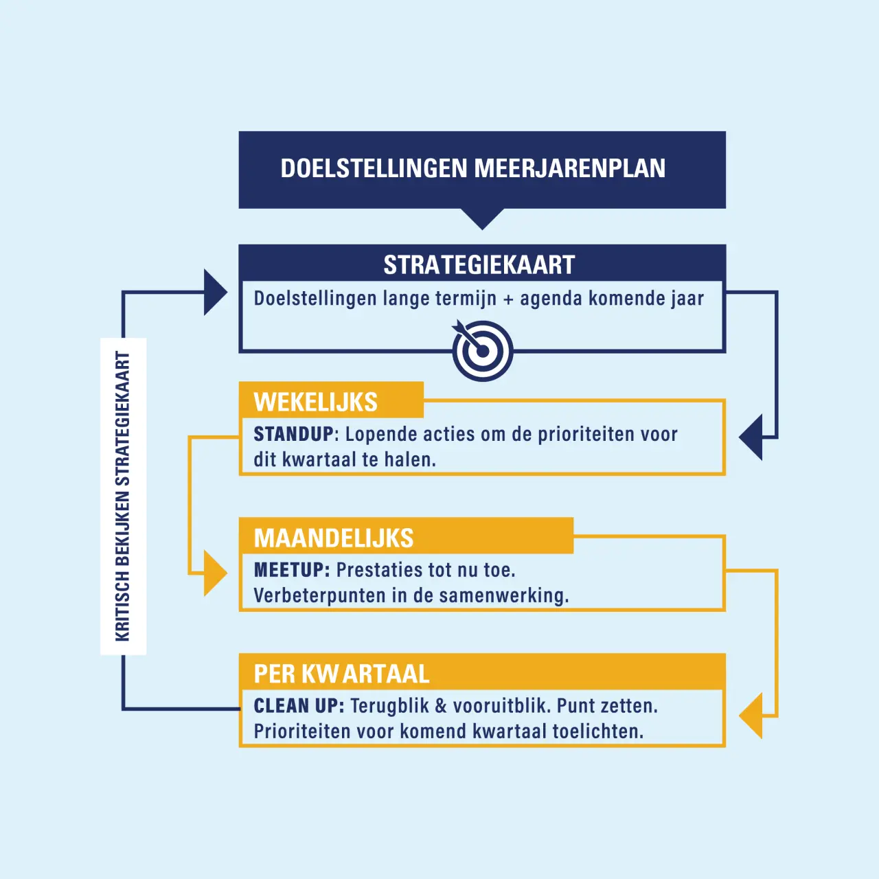 Wanneer we de strategie, KPI’s en actieplannen voor u als ondernemer en uw onderneming hebben geconcretiseerd, voeren we een kort cyclisch ritme van (intern) overleg en werksessies in. Hierdoor blijft u continu op de hoogte of u op koers ligt en wanneer bijsturing of reactie op nieuwe ontwikkelingen nodig is. Ook kunnen we op basis hiervan een goed strategisch advies uitbrengen. Samen maken we uw onderneming flexibel en weerbaar, pakken we de uitdagingen van vandaag aan, voorkomen we verrassingen en zorgen we voor de realisatie van uw doelstellingen.